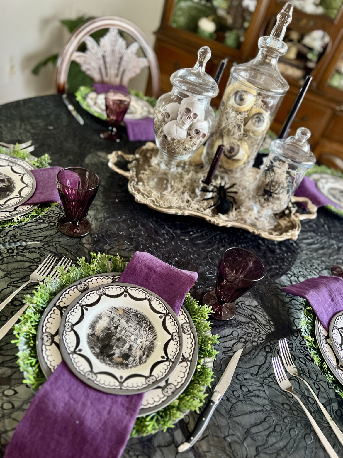 My second Halloween tablescape, in this year’s series. Tablescapes can be so much fun to put together – especially Halloween ones. I spotted these plates in an end cap at HomeGoods and immediately loaded them up on my cart. I love the colors, the design and I immediately knew I wanted something spooky yet elegant for an adult dinner party. I love how it turned out with dark and moody colors! Even my mother, who is anti-Halloween, loved this tablescape.