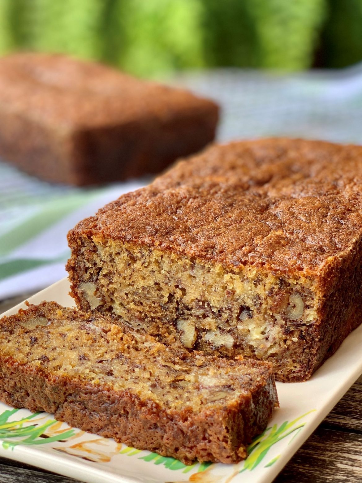 Most people buy a bunch at a time, but it’s hard to eat all of them – especially when they are overly ripe. That’s the perfect banana for baking so don’t throw them out! Save them for Banana Nut Bread! Banana bread is practically a staple in our home. We usually don’t eat all of them, so as as they ripen, we peel-and-freeze to bake banana bread. Growing up I wasn’t a banana fan yet this is our family go-to-recipe. Everyone loves it! This recipe is rich in flavor with beautiful sugary edges and it’s incredibly moist and dense at the same time. By dense I mean it’s not falling apart like cake, but it’s not a brick either. The ripeness of the bananas and folding technique makes a huge difference in the outcome. It doesn’t need anything else. This recipe yields two loaves – one to enjoy and one to share or freeze for later! You can also add chocolate chips to this recipe, but I never do.
