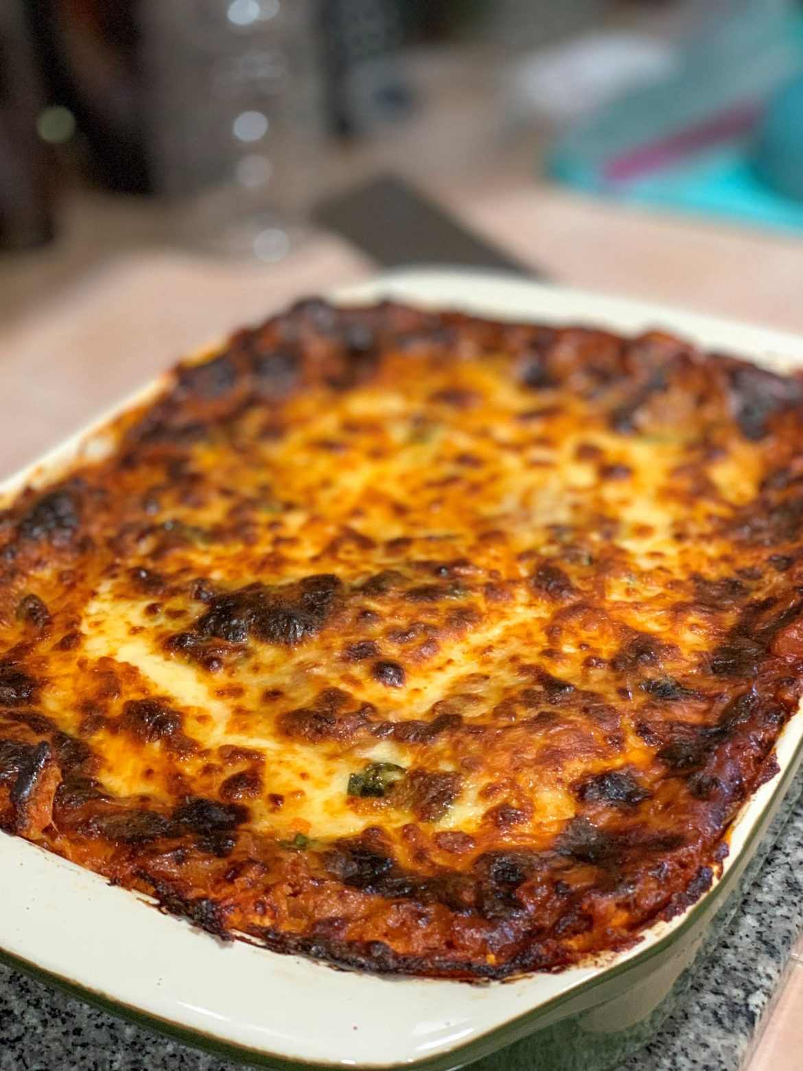 Allow the flavors to marry before baking at least a few hours. For best results, cover with plastic wrap and allow the lasagna to sit overnight. When ready to bake, bring the lasagna to room temperature for 30 minutes to remove the chill. Line a baking sheet with foil (for easy clean up) and place the lasagna on the baking sheet. Cover the lasagna with foil and bake for 25 minutes in a 375°F oven. Then remove foil and bake another 25 minutes uncovered. To get that golden crispy coloring, you may wish to broil the top for a New York minute. Don’t walk away from the oven whenever you are using the boiler – watch it like a hawk! Remove from oven when done and allow to cool for 15-20 minutes before serving.