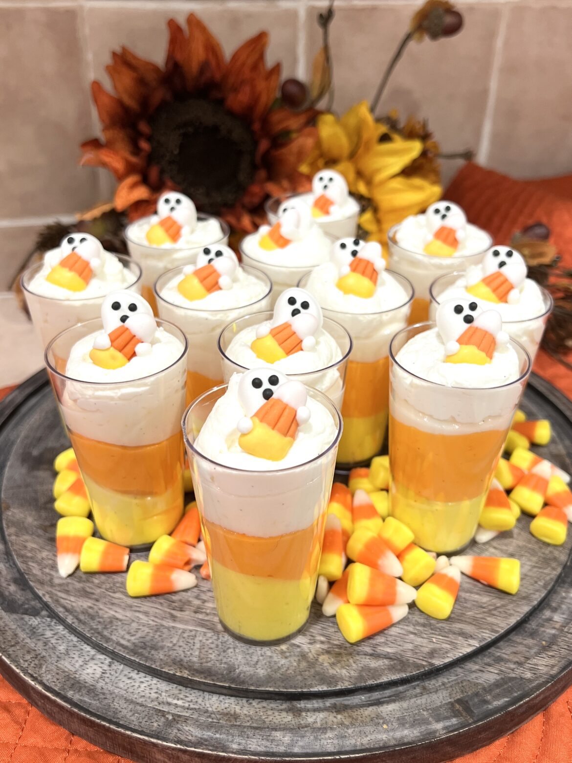 Are these not the cutest little no-bake cheesecake dessert shooters you’ve seen? I’m in love with these little candy corn hugging ghosts from Wilton. These little sweet treats are easy and fun to make. Enjoy them at your next fall party, spooky movie night or activity with the kids. I recently made them for my Carvings and Cocktails party and they were a huge hit.