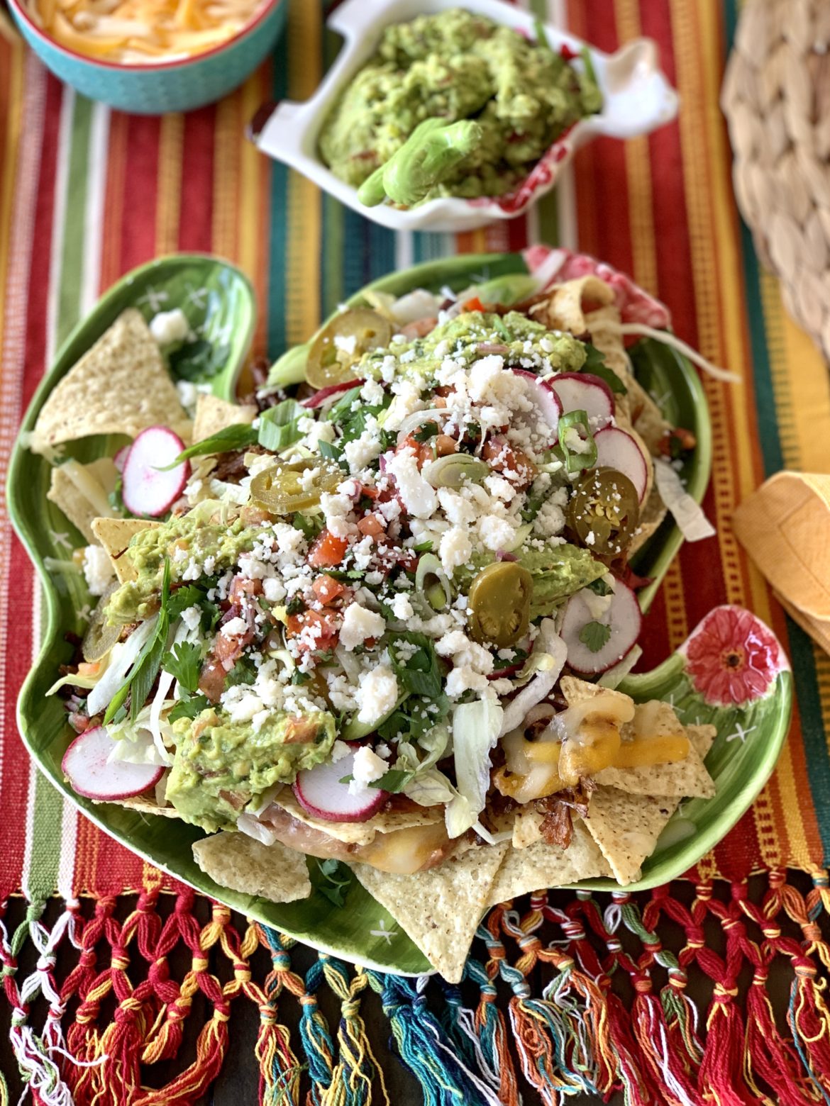 Add more cheese and pop back in the oven for a minute, just until the cheese melts, then load the nachos up with all the delicious toppings. I added shredded lettuce, homemade Pico de Gallo, homemade Guacamole, sour cream, sliced scallions, sliced radishes, sliced jalapeños and crumbled Cotija cheese – because one cheese just wasn’t enough. It was so delicious!