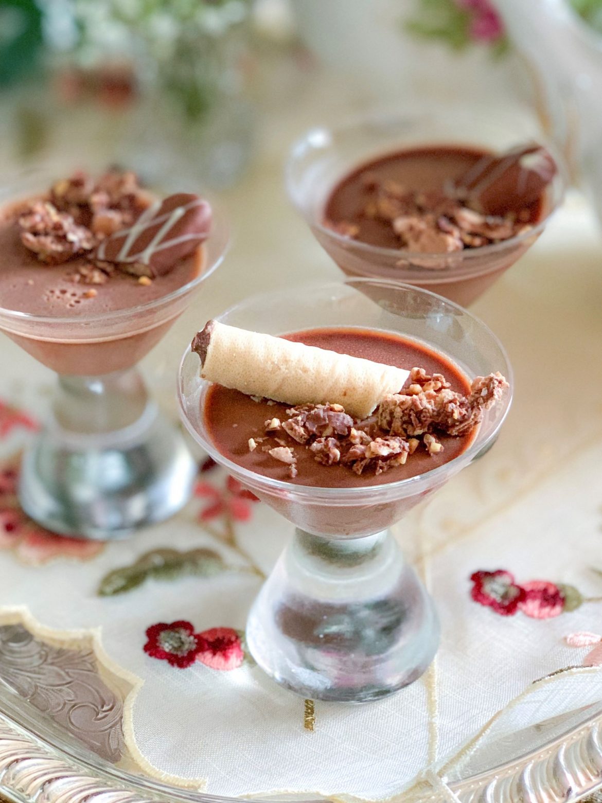 This delicious chocolate dessert is so creamy and decadent. An elegant finish to any meal. I love that you can make it ahead of time and simply garnish it with whipped cream, chocolate shavings, fresh fruit or broken up pieces of Ferrero Rocher hazelnut candy.