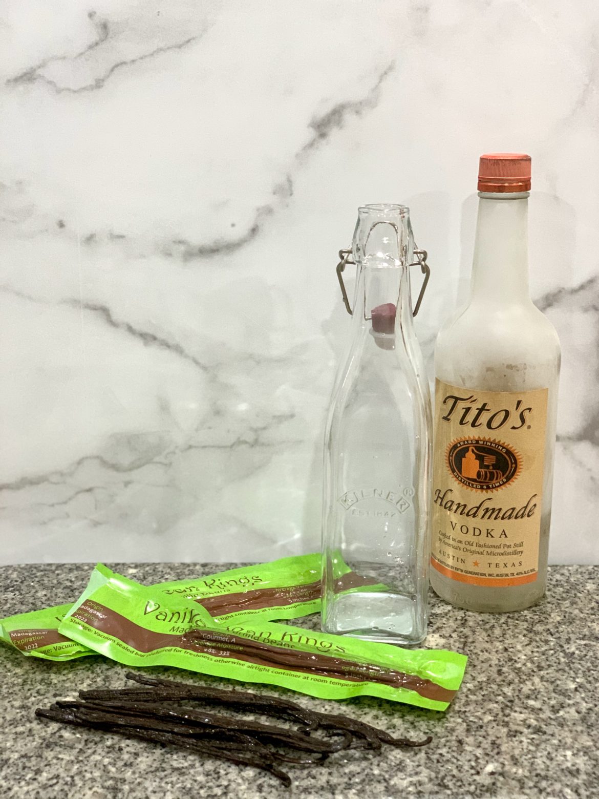 I purchased a Kilner 18.5 ounce preserve bottle with a clip top jar for a tight seal at HomeGoods along with 2 packets of 10 Grade A Madagascar vanilla beans on Amazon. I always have Tito’s Handmade Vodka at home, in the freezer. I split the beans, packed them in the bottle and filled the bottle with vodka.