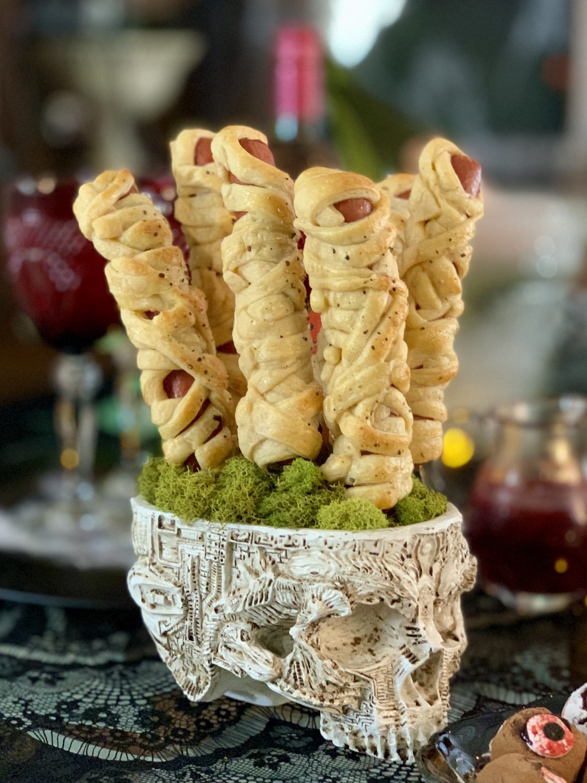 This is an easy and simple recipe that’s perfect for small kids to make. Keep in mind no two mummies need to be the same. You can impale them like I did in a skull candy dish I found on Amazon that’s been fitted with floral foam and moss. You can also serve them skewerless on a plate for an easy grab and go option or make mini mummies by using cocktail wieners.