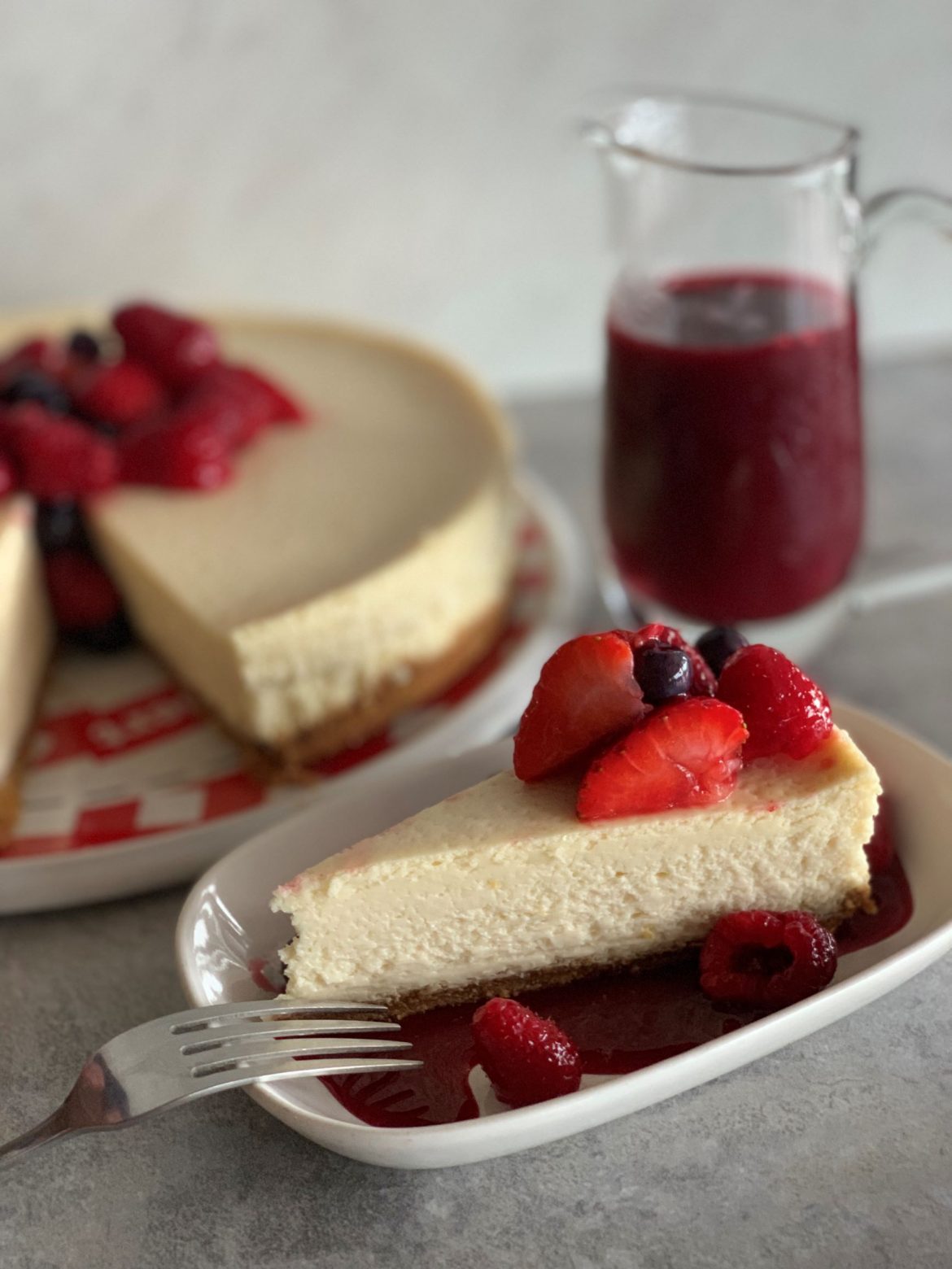 I’ve lost count of how many times I’ve made this cheesecake and variations of it for family, friends and sometimes total strangers. It’s truly a foolproof recipe and technique that ensures a smooth texture with no cracks. That’s right. Perfect, creamy and velvety texture with no cracks each and every time. Cheesecake pictured with my Raspberry Grand Marnier Sauce.