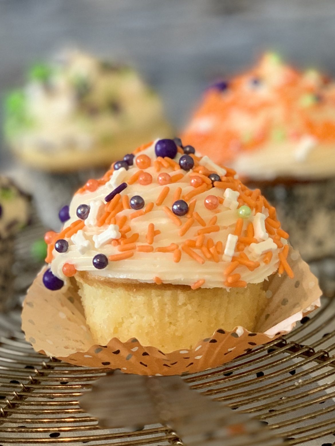 Frost and decorate the cupcakes. There’s no wrong way to frost a cupcake so whether you use a knife, a professional piping bag and tip or a plastic bag with the tip snipped off, it’s all good. As you can see below, none of my cupcakes turned out the same and I don’t care because they were amazing!