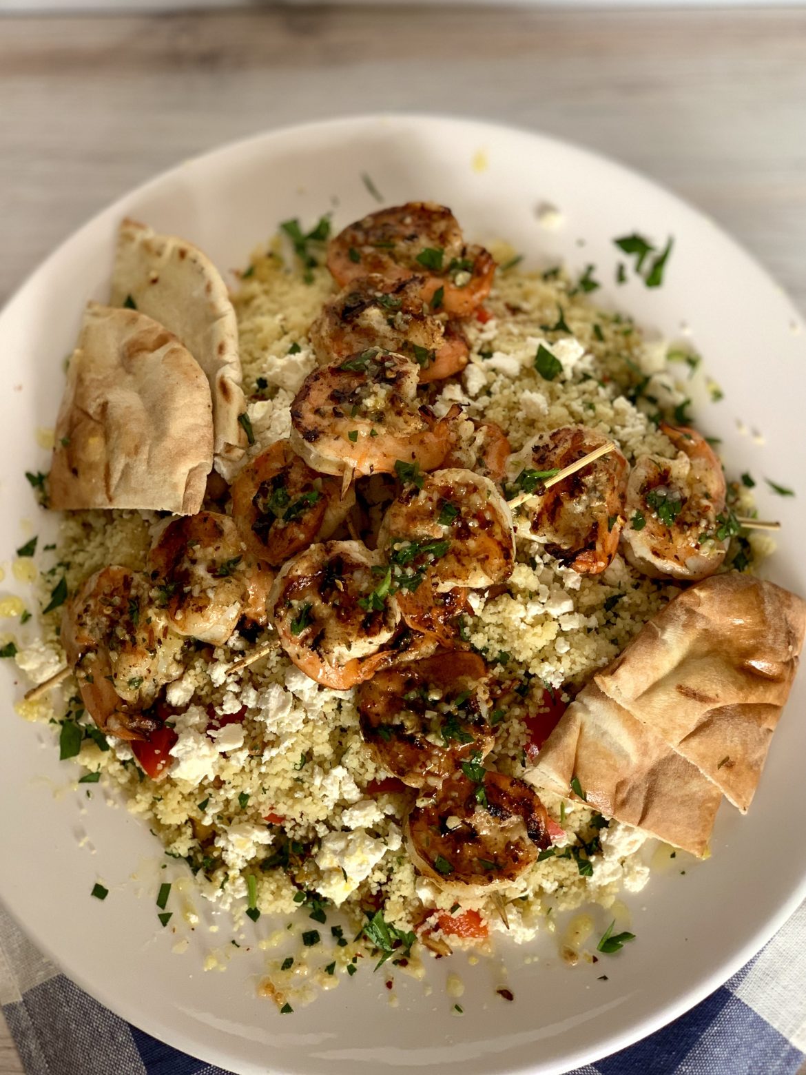 I made this mediterranean grilled shrimp and couscous dinner last year, when COVID hit, with pantry and freezer ingredients I always have on hand. It’s easy to make and so delicious. This recipe is perfect for easy entertaining since it can also be served at room temperature, making it a great back pocket recipe. Since the shrimp can be grilled indoors or outdoors, you can truly enjoy this meal any time of the year. Serve with nice Greek salad, warm pita wedges and a bottle of wine for a great meal.