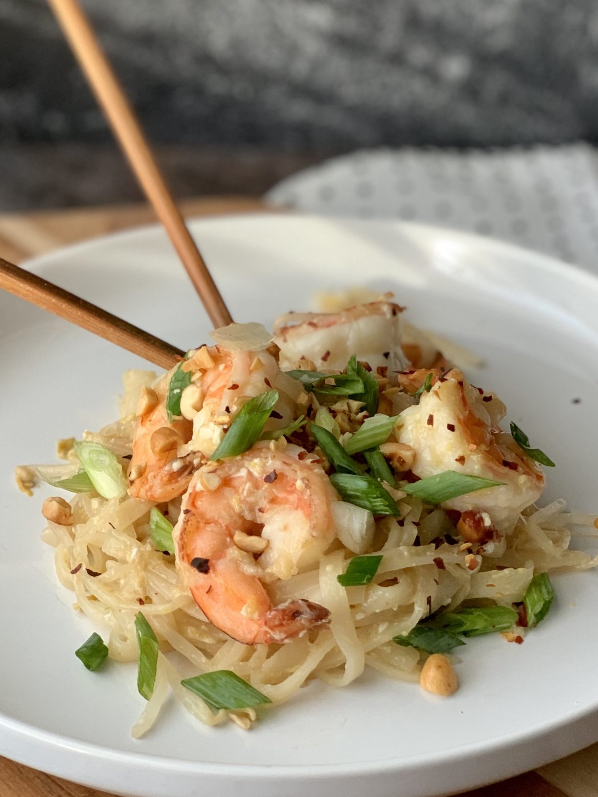Shut the front door! This Pad Thai is so d-e-l-i-c-i-o-u-s, it might just become my new favorite go to weeknight meal. It literally comes together in under 5 minutes and it’s fresh and bright with great flavors and texture. This recipe is from chef Kris Yenbamroong, owner of the award winning LA restaurant, Night + Market. Chef Kris uses ingredients that can be easily sourced in any grocery store because that’s how his grandma does it. You have to love a chef that honors his grandmother in his approach to cooking.