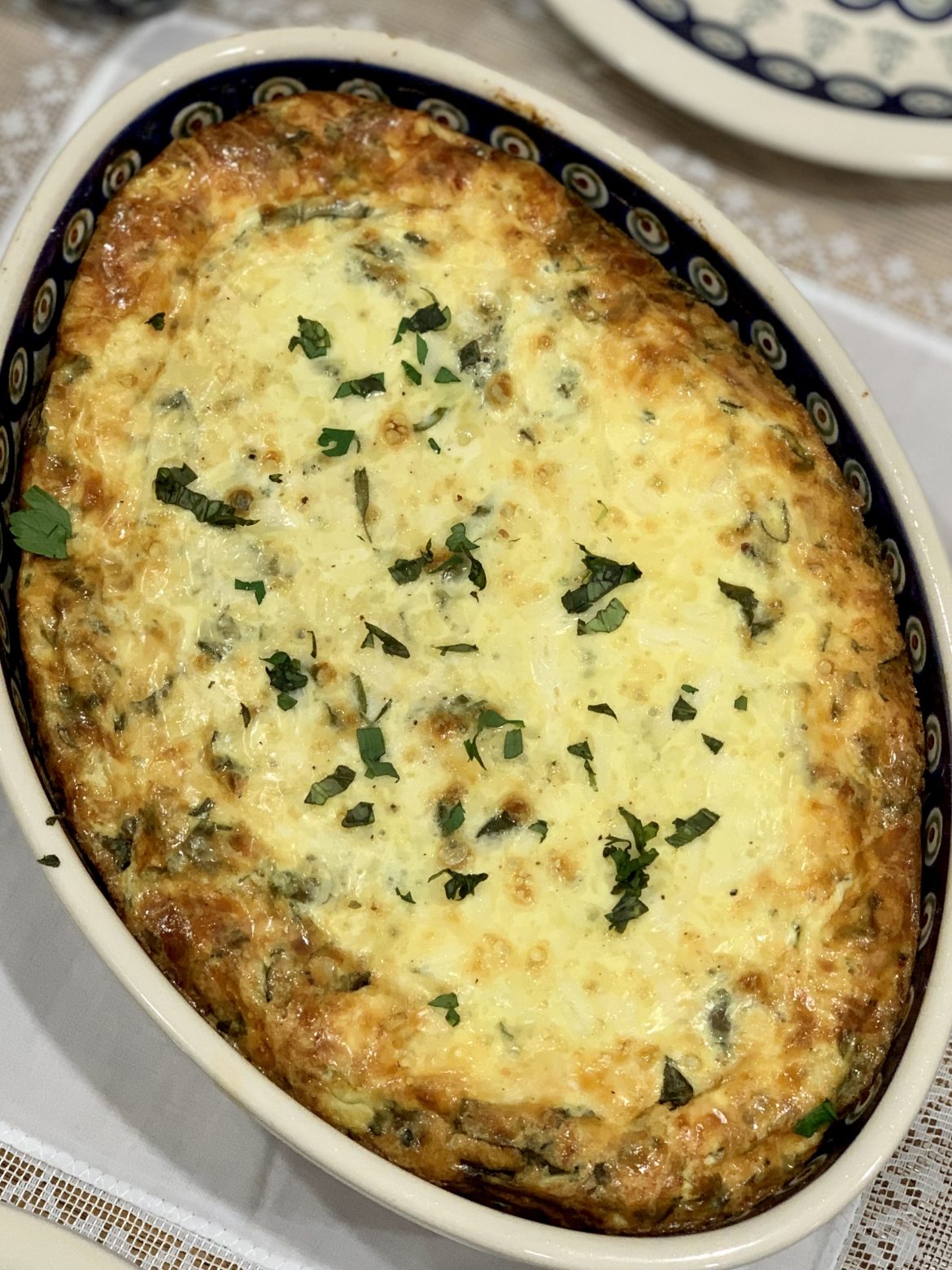 In the morning, place casserole on the counter and preheat oven to 350°F. Bake for about 1 hour or until the center is set and the egg is lightly browned. Garnish with remaining parsley. Rest for 10 minutes before serving.