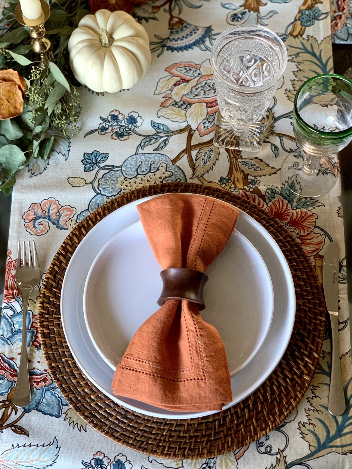 I crossed the table runners and ran the same greenery from my Simple Fall Tablescape straight across. Instead of using votive candles, I opted for formal brass candlesticks and long tapers candles. A few mini pumpkins and dry persimmons scattered about for added color. The pumpkin napkins complement the runner. While I used the same charger, plates, flatware and pressed glass water goblet, I did change the wine glass to another Italian glass with a green rim.