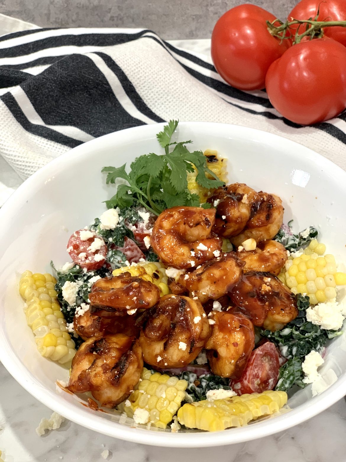 Chiffonade a bunch of kale (or your favorite greens) and add to a mixing bowl. Add cherry tomatoes, pickled red onions, corn, ranch dressing and Cotija or Feta cheese. Toss to combine. Plate salad and top with grilled BBQ shrimp and extra cheese. You could also serve these on tacos for a delightful option.