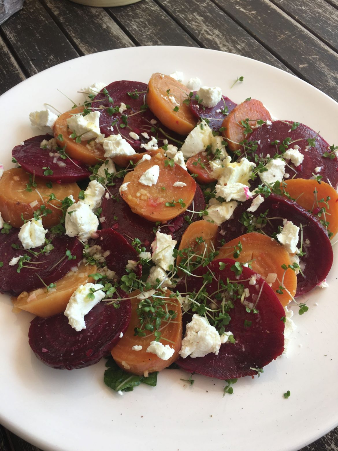 Assembling the salad: Place the slices in alternating colors, add crumbled goat cheese pieces, drizzle with the reserved 1/3 vinaigrette, microgreens and salt and pepper. Note: I made this a heartier salad by placing a bed of mixed greens under the beets. The reserve vinaigrette is sufficient to dress the greens.