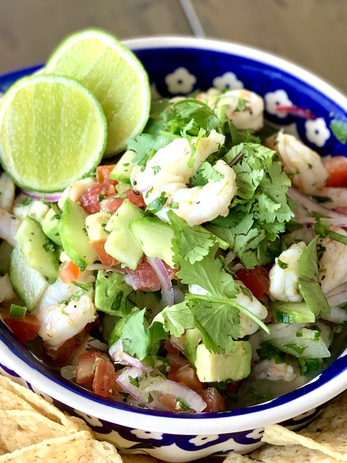 Oh ceviche!! The ancient art of cooking food in citric acid shows us that some methods are best left alone. Ceviche is one of those foods that has gained global popularity. Every country throughout Latin and Central America, the Caribbean and Europe has their own recipe, so feel free to experiment and add your favorite ingredients. This simple shrimp ceviche is made with avocado and jalapeños, making it a Mexican-style ceviche. What a great and delicious appetizer that’s easy to make!
