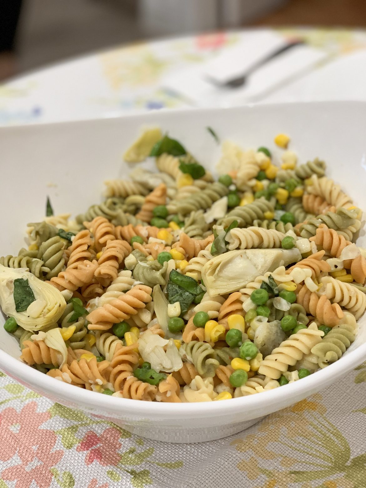 Add the drained corn, frozen peas, artichokes and basil. Toss to coat well. Depending on your pasta, you may need to add the remaining dressing mix.